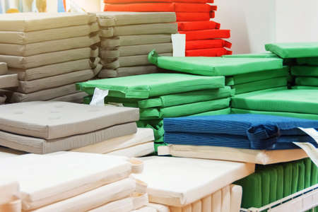 Multi-colored pillows background. Creative background made of pillows. sweet home, household, and vacation concept