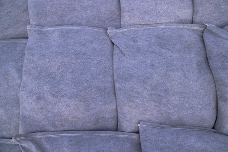 Gray couch surface background with buttons. Sofa pillow detail, close up