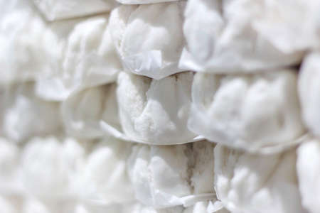 White non-woven fabric in rolls is on the shelves of the warehouse. Covering material. Textiles for the production of rags. Close-up with copy space