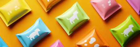 Sleek packaging designs for both dry and wet pet food are showcased in vivid colors, with an organized flat layout that highlights each product visually.