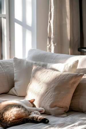 Beige pillows on canvas sofa, soft focus background.