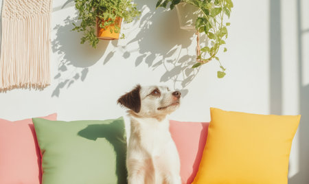 Small dog sitting on a cozy couch with colorful pillows, surrounded by plants and sunlight in a warm, inviting space