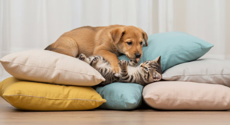 Playful Puppy and Kitten: Puppy playfully paws at a kitten lying on a colorful pile of pillows.