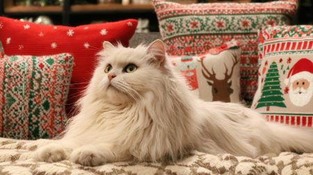 A beautiful long-haired white cat is resting on a patterned surface, surrounded by colorful holiday-themed cushions.