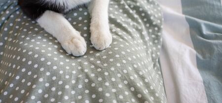 cute little cat paws on human belly in bed