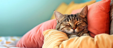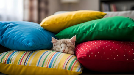 A cute kitten sleeping soundly nestled between bright blue, green, and red pillows on a sofa. The cozy and colorful indoor scene captures the peacefulness of a resting pet in a comfortable home.