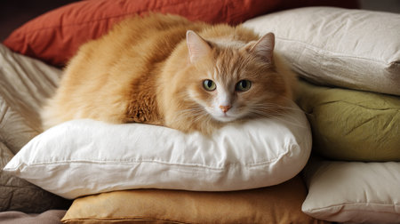 An AI generated illustration of a relaxed feline lounging on a plush cushion in a cozy interior