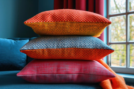 A stack of three vibrant, multi-colored pillows with assorted patterns placed neatly by a sunlit window in a cozy room.
