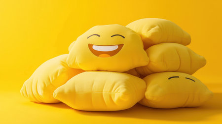 A cheerful pile of yellow emoji cushions with playful grinning face, set against vibrant yellow background