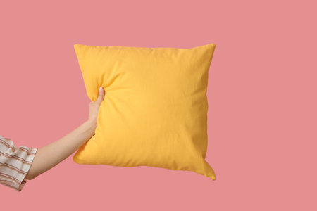 Woman with yellow pillow on pink background
