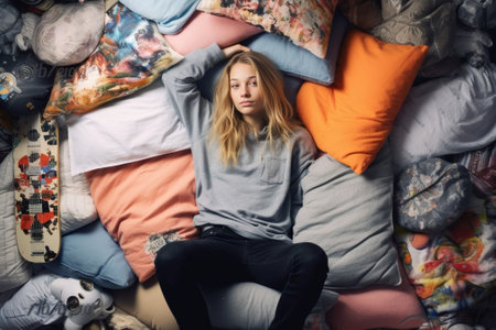 A woman sitting in front of a pile of pillows. Generative AI image.