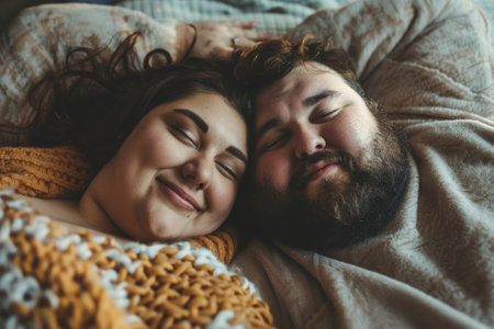 Cheerful overweight couple in a loving relationship, sharing laughter and happiness together..