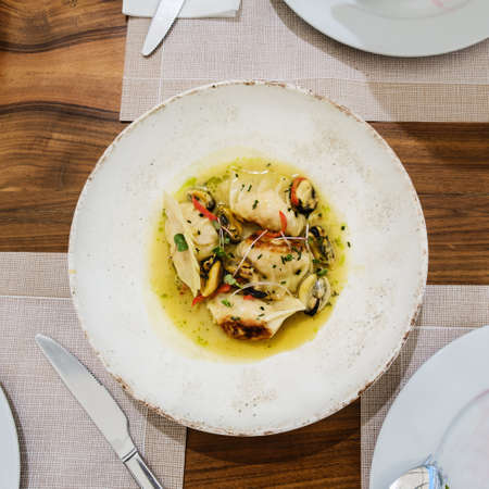 Dumplings Gyoza with crab filling served with mussels and microgreens, top view