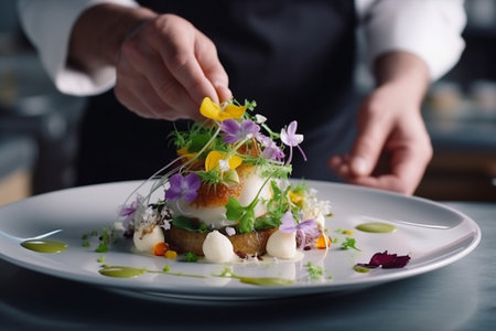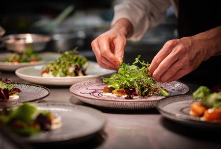Chef Garnishing Gourmet Dish with Fresh Herbs in Modern Restaurant Kitchen