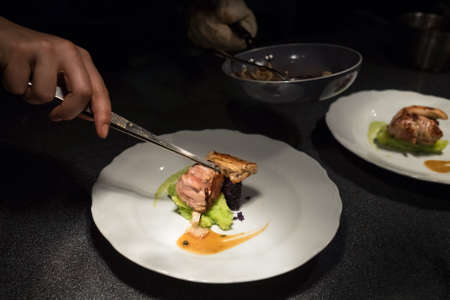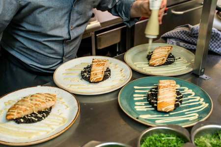 Chef is decorating fried salmon steak with green pea, work at commercial kitchen, toned image