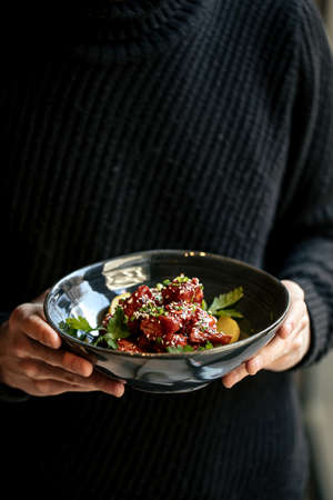 Close-up of a plate with a juicy dish of beef tartare. Tasting a delicious meal prepared by the chef