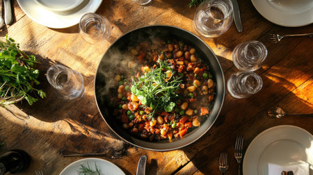 A beautifully arranged vegetable dish steaming on a rustic table, surrounded by fresh herbs and simple dinnerware, inviting a wholesome dining experience.
