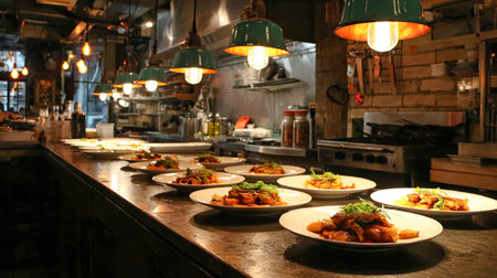 A bustling restaurant kitchen showcases vibrant dishes of pasta, fresh vegetables, and a warm dining atmosphere, capturing the art of culinary creation.