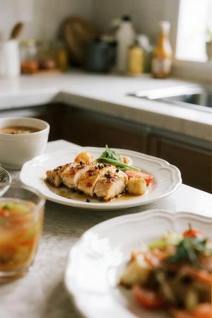 A skilled chef meticulously plates gourmet dishes in a modern kitchen, showcasing fresh ingredients and artistic techniques for an elevated dining experience.