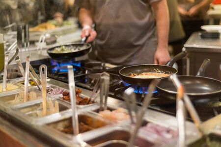 Professional chef cooking in the kitchen restaurant at the hotel, preparing dinner.