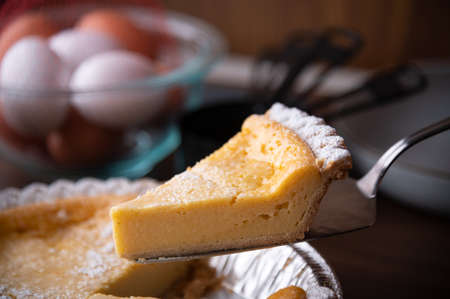 Traditional South African milk tart slice isolated on white background