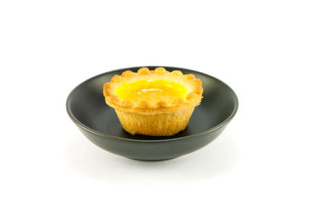 Single small yellow lemon jam tart in a small black dish with a white background