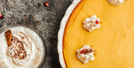 Traditional American pumpkin pie with cinnamon decorated with whipped cream and latte. Long banner format. top view.