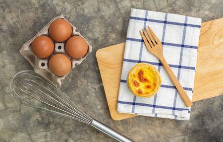 dessert egg tart or portugal egg tart sweet custard cream on wooden board and bright gray concrete background with eggs ingredient and cooking tools, top view