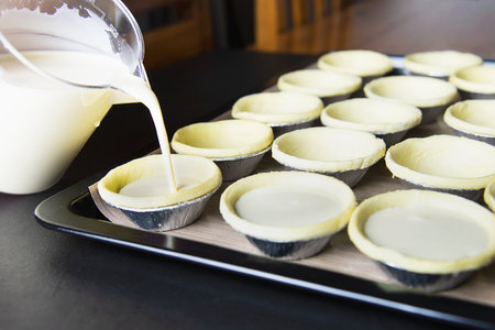 Lady cooking homemade egg tart - people with favorite dessert bakery concept