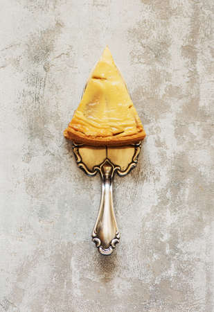 piece apple pie and spatula on gray concrete background. apple tart, top view