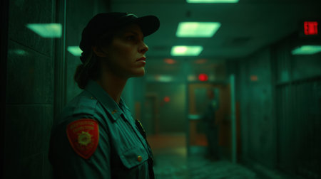 Caucasian female officer in uniform stands in a dimly lit corridor of the state penitentiary, observing surroundings during her evening shift.