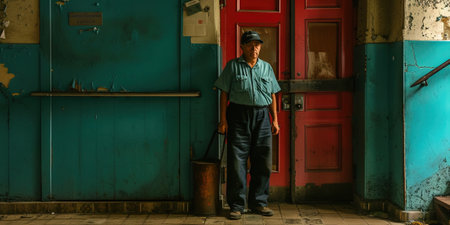 Portrait of an old man standing in front of an old door
