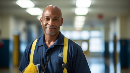 Janitor readies for school cleaning bright hallway mop and bucket in hand