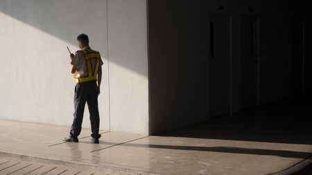 Asian security guard in safety vest walking on sidewalk of parking garage, he using walkie-talkie or portable radio transmitter with sunlight and shadow on surface of gray cement wall background