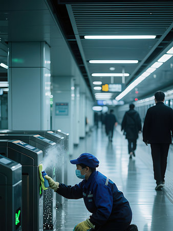 A man in a protective mask and gloves cleans the corridor of the subway station.