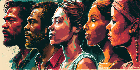 Different human faces in profile in row. Watercolor art. Concept of elections, equal voting rights, multicultural society, voter diversity, and inclusive politics. White background. Wide banner
