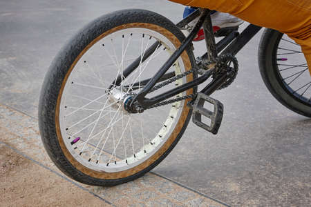 Bike wheel detail with rider. Sport background. Horizontal