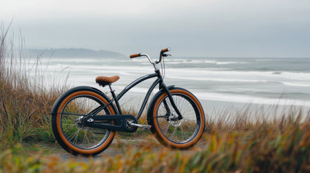 A vintage-style bicycle stands gracefully on the coastal grassland, framing the serene ocean waves and overcast sky. Ideal for travel and lifestyle themes.