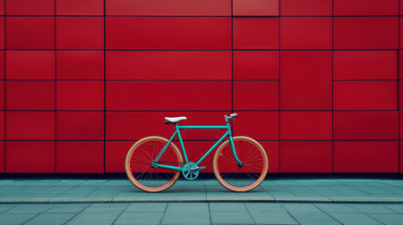 A vibrant bicycle stands against a striking red wall, capturing the essence of modern urban life with its colorful design and minimalist appeal.