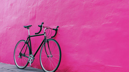 A stylish black bicycle rests against a vivid pink wall, creating a striking contrast that embodies urban culture and modern design. Perfect for lifestyle-themed projects.