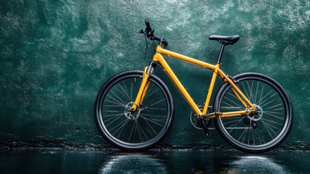 A vibrant orange mountain bike stands against a unique green wall, creating a striking contrast. The wet pavement adds a fresh, dynamic feel. Perfect for themes of outdoor adventure and urban lifestyle.