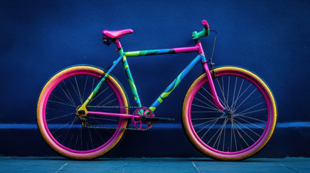 A striking colorful bicycle stands against a vivid blue wall, showcasing an eye-catching design perfect for urban environments and active lifestyles.