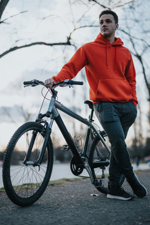Young man with bicycle enjoying leisure time in urban park, exemplifying a healthy and active lifestyle