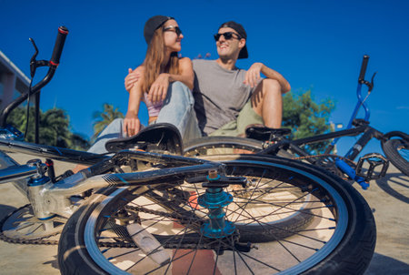 Young happy couple enjoy BMX riding at the skatepark
