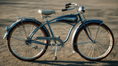 A classic bicycle rests against a textured brick wall in an outdoor setting, likely a street or public space. The image displays a vintage aesthetic with metal frame and leather seat. Soft sunlight bathes the scene, highlighting the details. Suitable for commercial projects or editorial use.