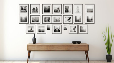 Framed visuals of diverse subjects are arranged on a sleek wall, creating a captivating gallery that combines modern design with artistic expression.