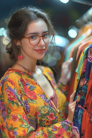 close-up of a contented young lady selecting clothing in a boutique,