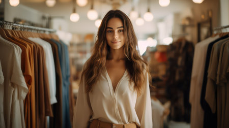 Young woman browsing fashion apparel in trendy clothing store for stylish outfits