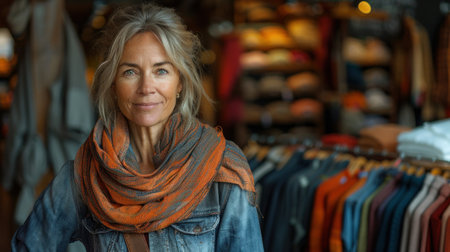 A woman stands in a clothing store, gazing thoughtfully at the camera. She wears a brown coat with a light top and has shoulder-length hair, surrounded by clothes.