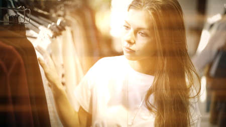 Young woman with brown hair is choosing clothes to buy in a shop. Shopping concept.